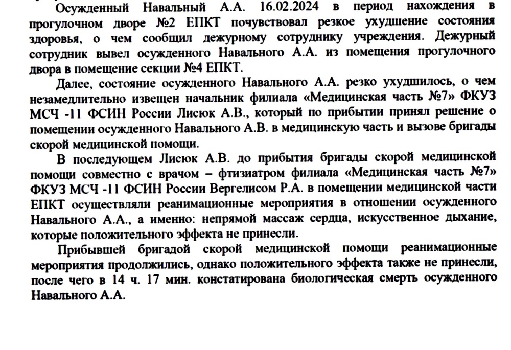 Алексей Навальный был в камере ШИЗО. В 12:10 его вывели на прогулку. Во время нее ему стало плохо, его «поместили» в медсанчасть и там он умер. Скорая приехала, но сделать ничего не смогла, в 14:17 констатирована смерть.