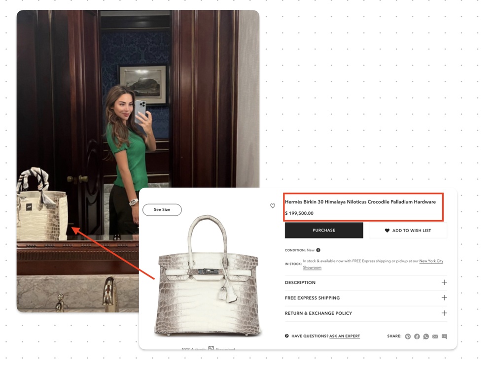 Включая вот эту, из блестящего кремового крокодила — такая продается за 20 миллионов рублей.