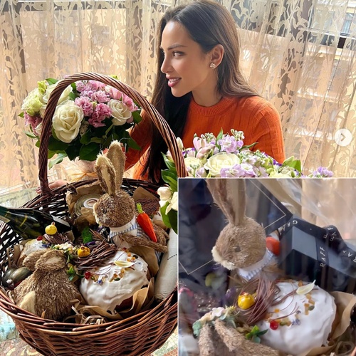 Ну и образ жизни Альбины, конечно, указывает на наличие очень обеспеченного спонсора. Вот такую милую корзинку она получила в подарок на Пасху. Яички, зайчки, вино и едва заметны коробки с украшениями Graff — это один из самых известных и дорогих брендов бриллиантовых украшений.