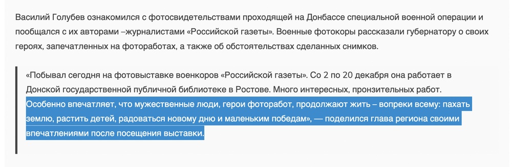 Или вот, побывал на выставке военкоров, там Голубев говорит, что его очень впечатляет то, что люди, вопреки всему, продолжают пахать землю, растить детей и радоваться новому дню.