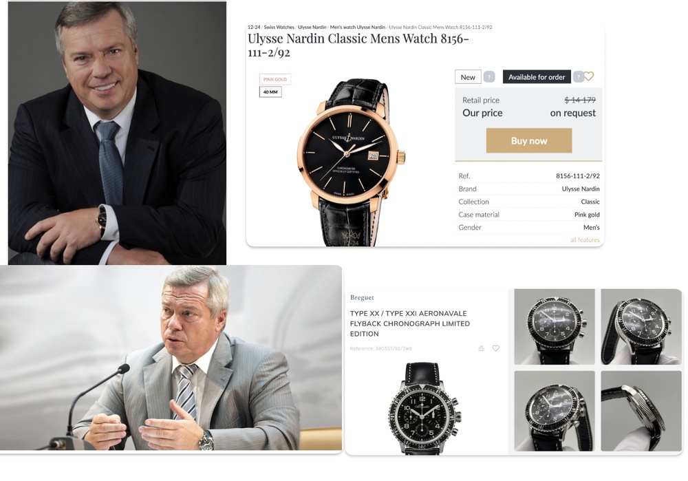 Второй обязательный элемент путинского жулика-единоросса: люди вокруг тебя в любую минуту должны точно понимать, насколько ты богат и статусен. Для этого нужна внушительная коллекция часов. Такая коллекция у Голубева есть. Губернатор области любил красоваться в часах за полтора миллиона.