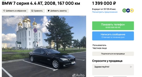 Какую-то совсем топорную и бессовестную схему Перович проворачивает с арендой автомобиля. Вот, например, BMW 7-ой серии, 2008 года выпуска, то есть 17-летняя. Сейчас такую можно легко купить за 1,4 млн.
