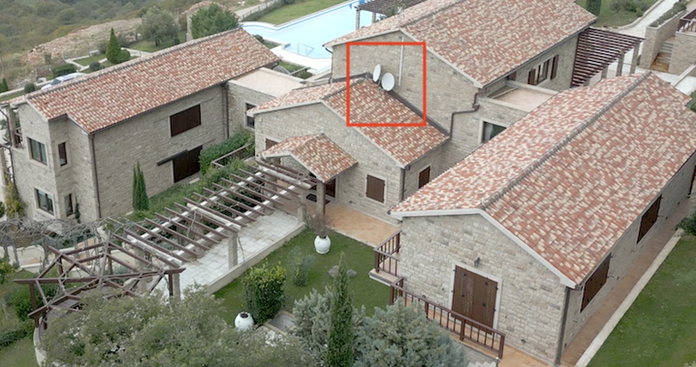 Конкретное расположение черногорского дома, в котором все это происходит, тоже найти не сложно. Смотрим вот на эту фотографию и сравниваем со спутниковой картой нужной нам части Черногории. Тут и находим очень похожий дом — хорошо виден бассейн, по форме напоминающий ухо Микки-Мауса на углу.