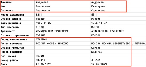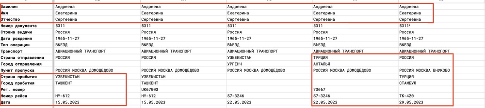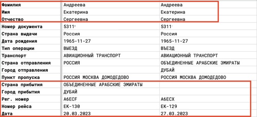 Затем мы взяли все данные о её перелётах и совместили их с графиком работы. Результат говорит сам за себя: как только её недельная смена заканчивается, Андреева сразу же уезжает из России и от Путина, при котором вроде бы в России не жизнь, а благодать. Давайте на конкретных примерах, возьмём данные за первые шесть месяцев 2023 года.