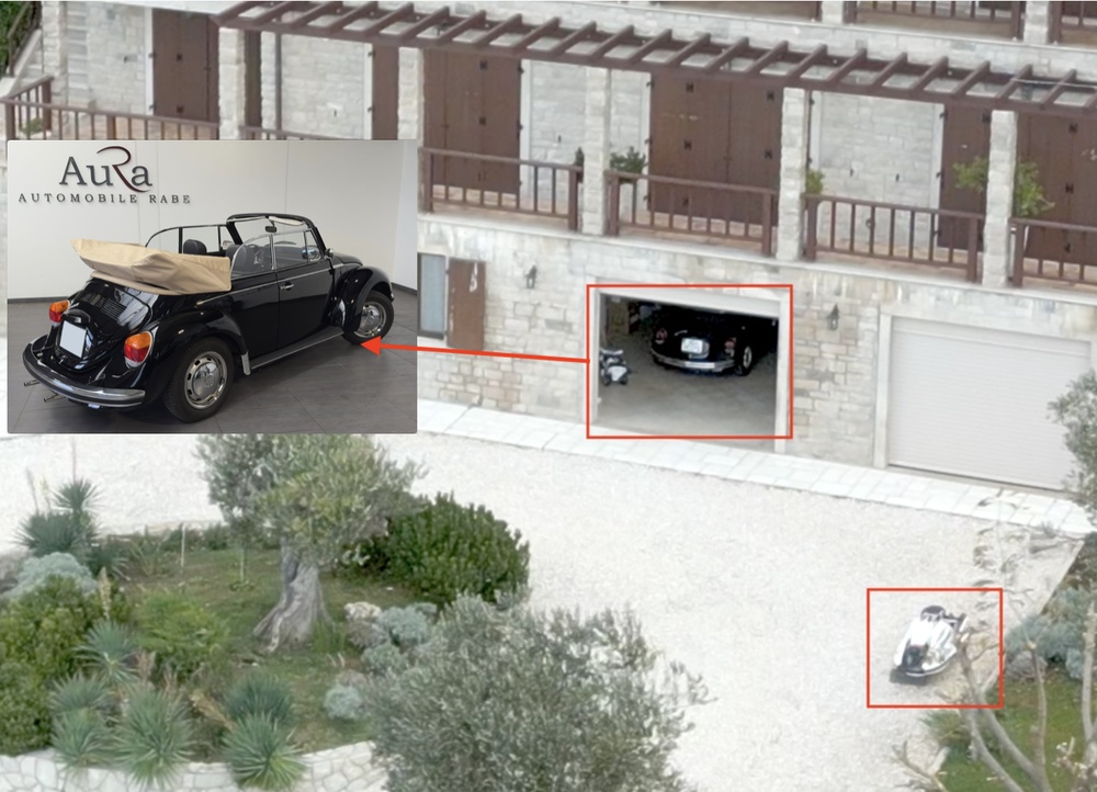 На первом этажа дома виднеется гараж с припаркованным раритетным Фольксваген Жук, а перед ним стоит гидроцикл — ведь море совсем рядом.