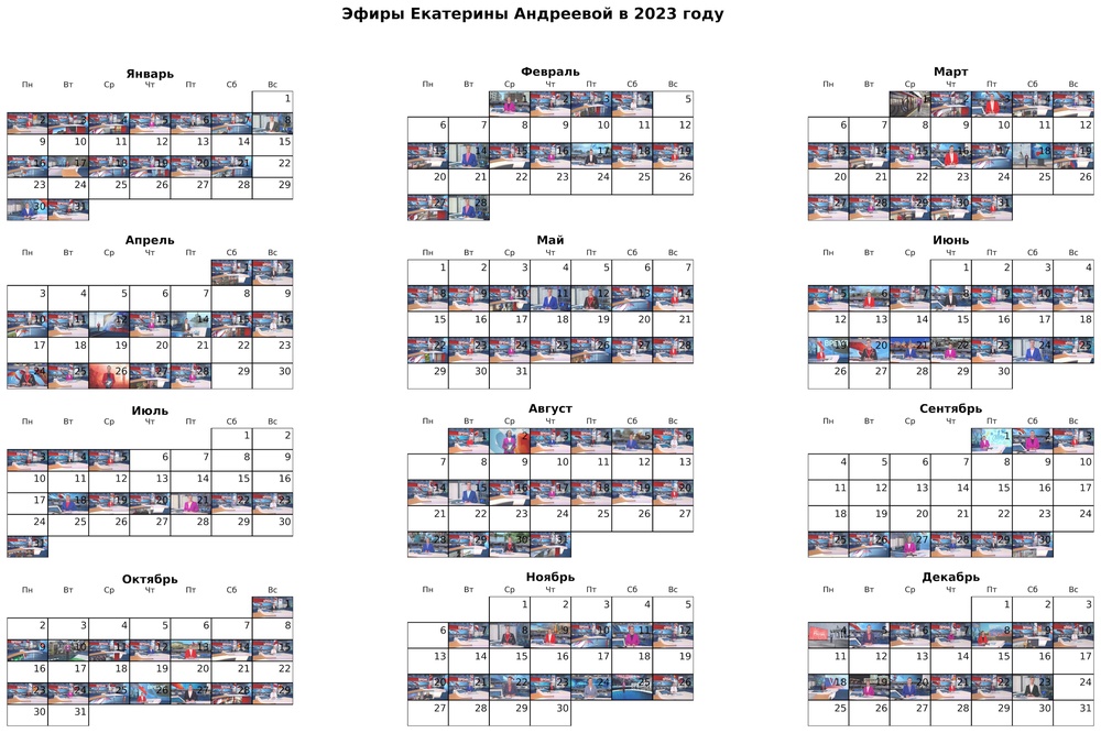 Мы нашли все эфиры Екатерины Андреевой за последние пять лет — это примерно 1000 выпусков, нанесли их на календарь и выяснили её примерный график. Чаще всего Андреева ведёт эфиры по принципу неделя через неделю и иногда уходит в отпуск.