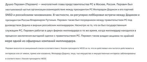 Если вам покажется это какой-то несущественной символической мелочью, с вами не согласится правительство США, которое в 2023 году ввело против Душко Перовича санкции. В пресс-релизе сказано, что муж Екатерины Андреевой лоббировал интересы президента Республики Сербской Милорада Додика (который тоже под санкциями) и организовывал его встречи с Путиным.
