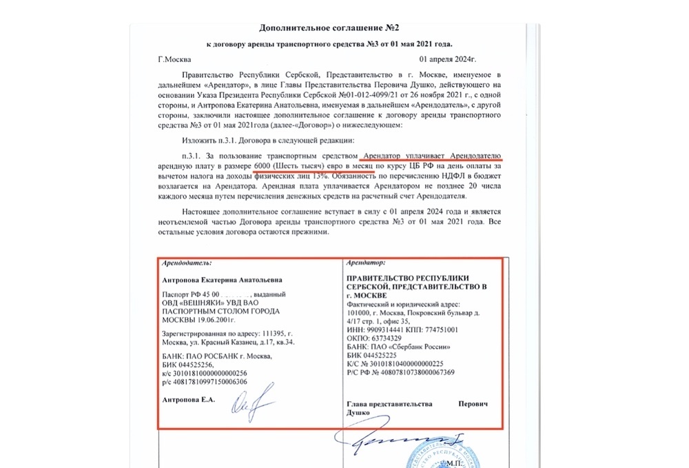 И почему-то она получает по 6000 евро в месяц от республики Сербской за автомобиль дочери Андреевой. Более свежий похожий автомобиль с сайта объявлний даже при аренде посуточно вышел бы в три раза дешевле.