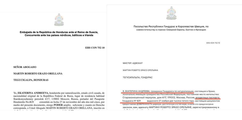 Гражданство именно этой страны мы нашли у ведущей Екатерины Андреевой. У нас есть доверенность, которую она выдала местному адвокату для представления своих интересов. Из этого документа видно, что паспорт Гондураса был выдан ей почти 20 лет назад — 27 ноября 2005 года. В доверенности указан и номер этого паспорта.