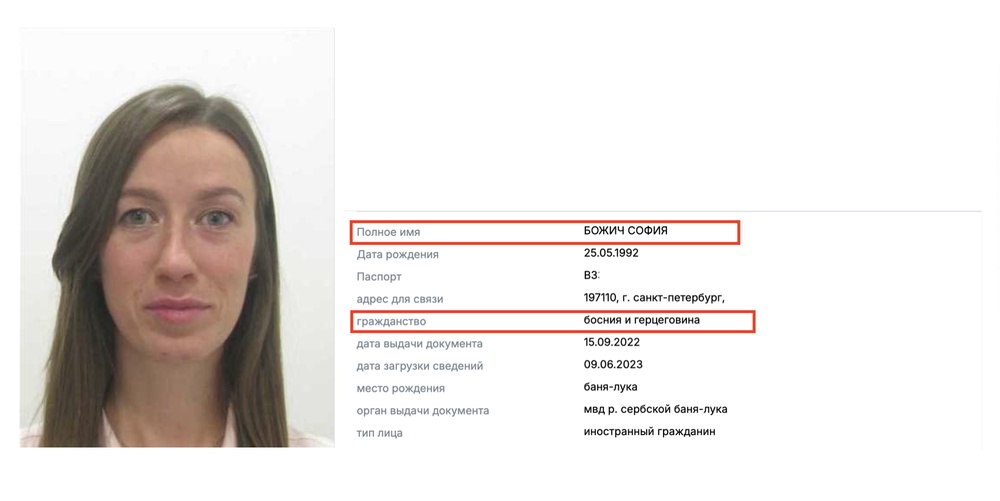 Ну и в качестве третьего примера давайте обратим внимание на сотрудников «Эна Инвест» — тех людей, которые получают там зарплату. Благо, кроме директора и бухгалтера, их там всего двое. Это очень интересные персонажи — иностранки: одну зовут София Божич, ей 33 года, она боснийка.