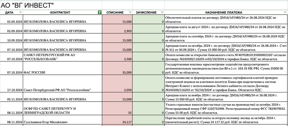 Начнем с фирмы «ВГ Инвест», которая принадлежит топ-менеджерам «Балтики», и которая якобы купила завод у иностранцев. Ее создали в августе 2024 года и там не происходило ровным счетом ничего примечательного. Никакого бизнеса: какие-то мелкие платежи за банковские услуги, нотариусу, налоги на 11 000 рублей, в общем фирма-пустышка.