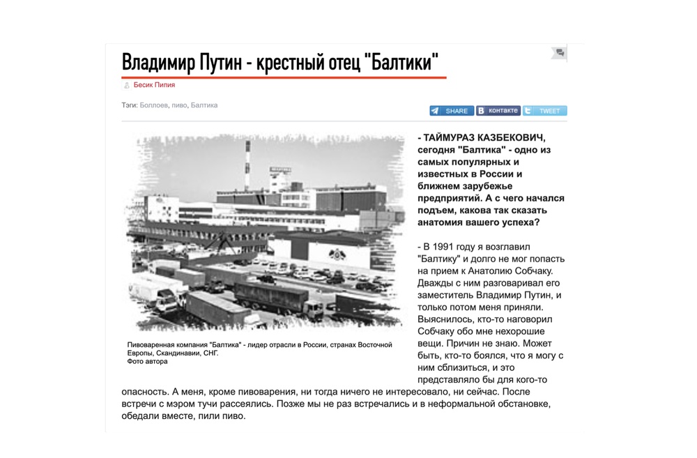Сам мэр Собчак в одном из своих последних интервью говорил, что создание «Балтики» — это заслуга именно мэрии города и конкретно Владимира Путина. Так Путин и стал считаться «крестным отцом» «Балтики».