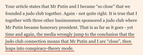 В открытом письме FT: Тимченко жалуется, что «СМИ раз за разом ошибочно делают вывод, что они с Путиным „близко дружат“ — это все конспирология». Они просто время от времени бывали на одних и тех же мероприятиях или пересекались.