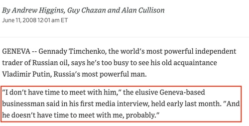 В своем первом в жизни интервью WSJ в 2008 (данном после обещания журналистов, что они не опубликуют его фотографию — Тимченко даже в лицо тогда никто не знал) он говорит, что «У меня нет времени на встречи с Путиным, а у Путина нет времени на встречи со мной».
