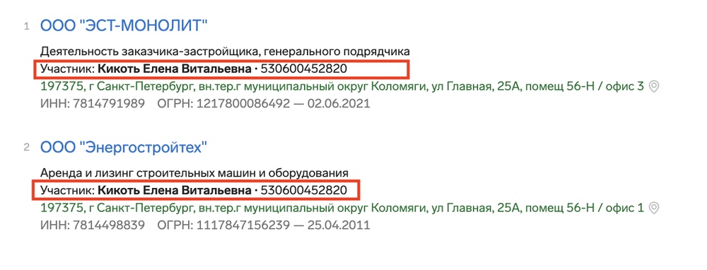 Со второй фирмой Кикотя достаточно похожая история. Но там бизнес подаёт чуть больше признаков жизни, чем «Эст-Монолит»: она давно существует, там много сотрудников, какая-то деятельность, и не так всё кустарно, как в прошлом случае.