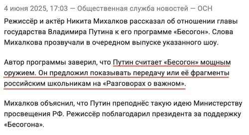 «Посадили солдат, показали серию, обсудили», — так описывал просмотр «Бесогона» замминистра обороны Картаполов. Прямо как в школах. И тоже не бесплатно: за 2024 год Михалков получил от структуры министерства обороны 560 тысяч рублей.