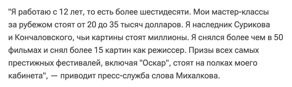 Разгорелся скандал и Михалкову пришлсоь оправдываться — было сказано, что он успешный режиссер, удачливый инвестор и вообще наследник Сурикова и Кончаловского, чьи картины стоят миллионы. Недоразумение уладили и больше доходы Михалкова никогда не раскрывались, но и этого одного документа нам хватит.