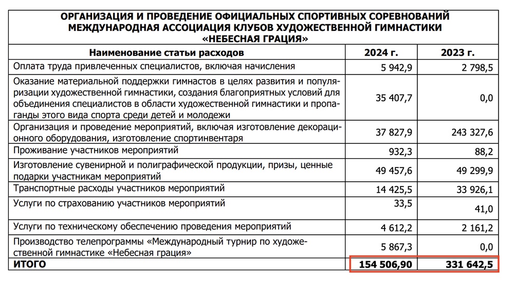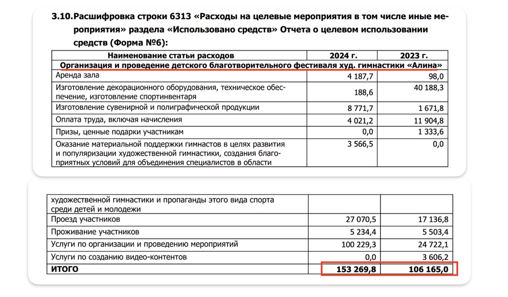 Из точно такого же отчета за подписью Кабаевой видим, что за 2 года этот фонд потратил почти 500 миллионов рублей на другое мероприятие имени Кабаевой — турнир по художественной гимнастике «Небесная Грация».